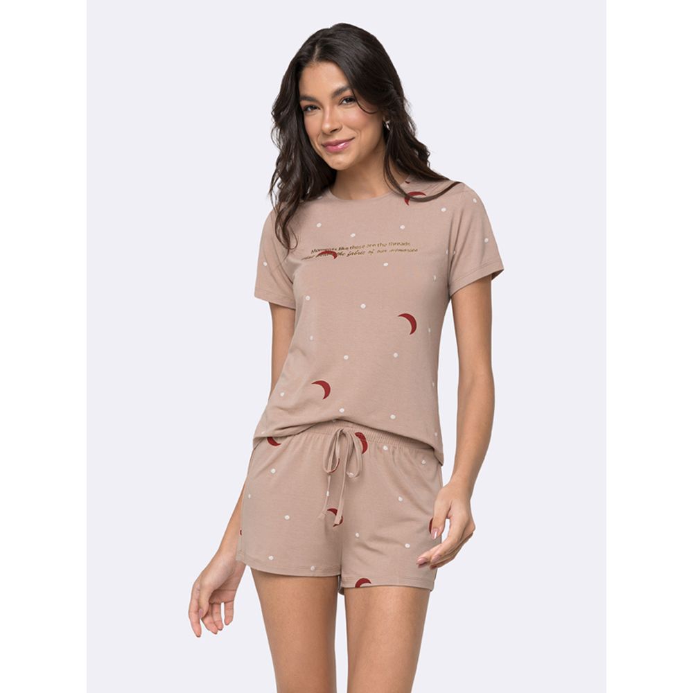 A estampa de luas e poás em tom terroso traz um visual acolhedor, enquanto a frase em foil dourado no peito adiciona um toque de brilho sutil e significado.